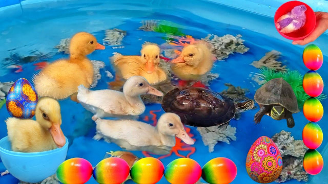 cute ducks bathe with sea turtles, fish, eggs suprise and sea animals